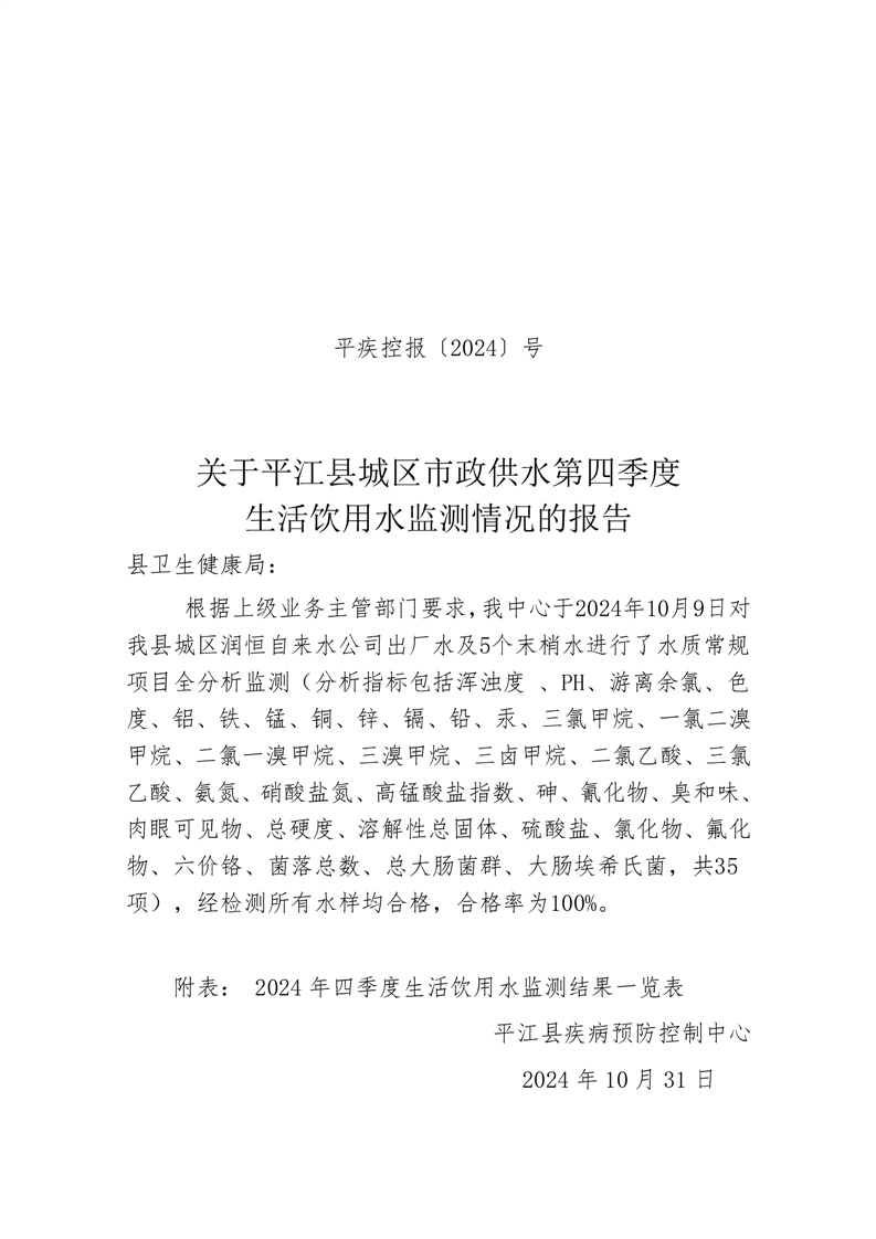 2024年第四季度饮用水监测情况报告