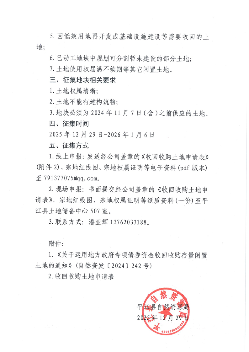 3、平江县自然资源局关于运用地方政府专项债券资金收回收购存量闲置土地的征集公告.pdf