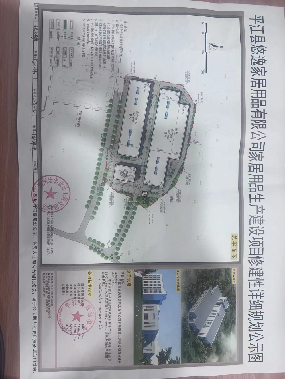 今有平江县悠逸家居用品有限公司向我局提交审查《平江县悠逸家居用品有限公司家居用品生产建设项目修建性详细规划公示》的申请。现根据《中华人民共和国行政许可法》和《中华人民共和国城乡规划法》的规定,对该项目规划依法予以公示。