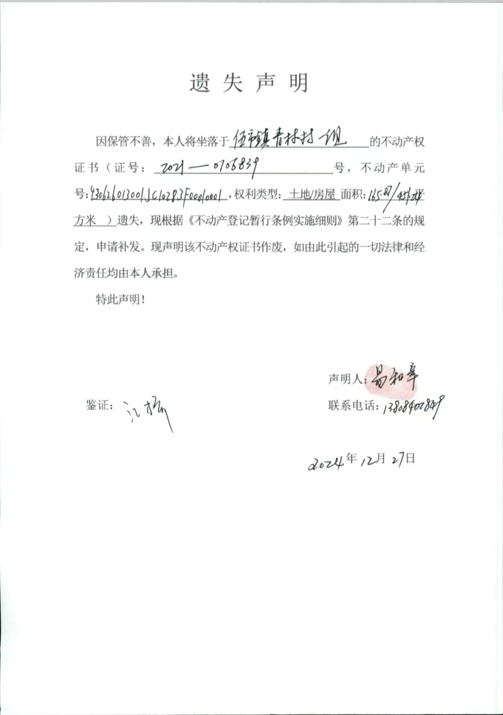 易和章 不动产权证遗失声明