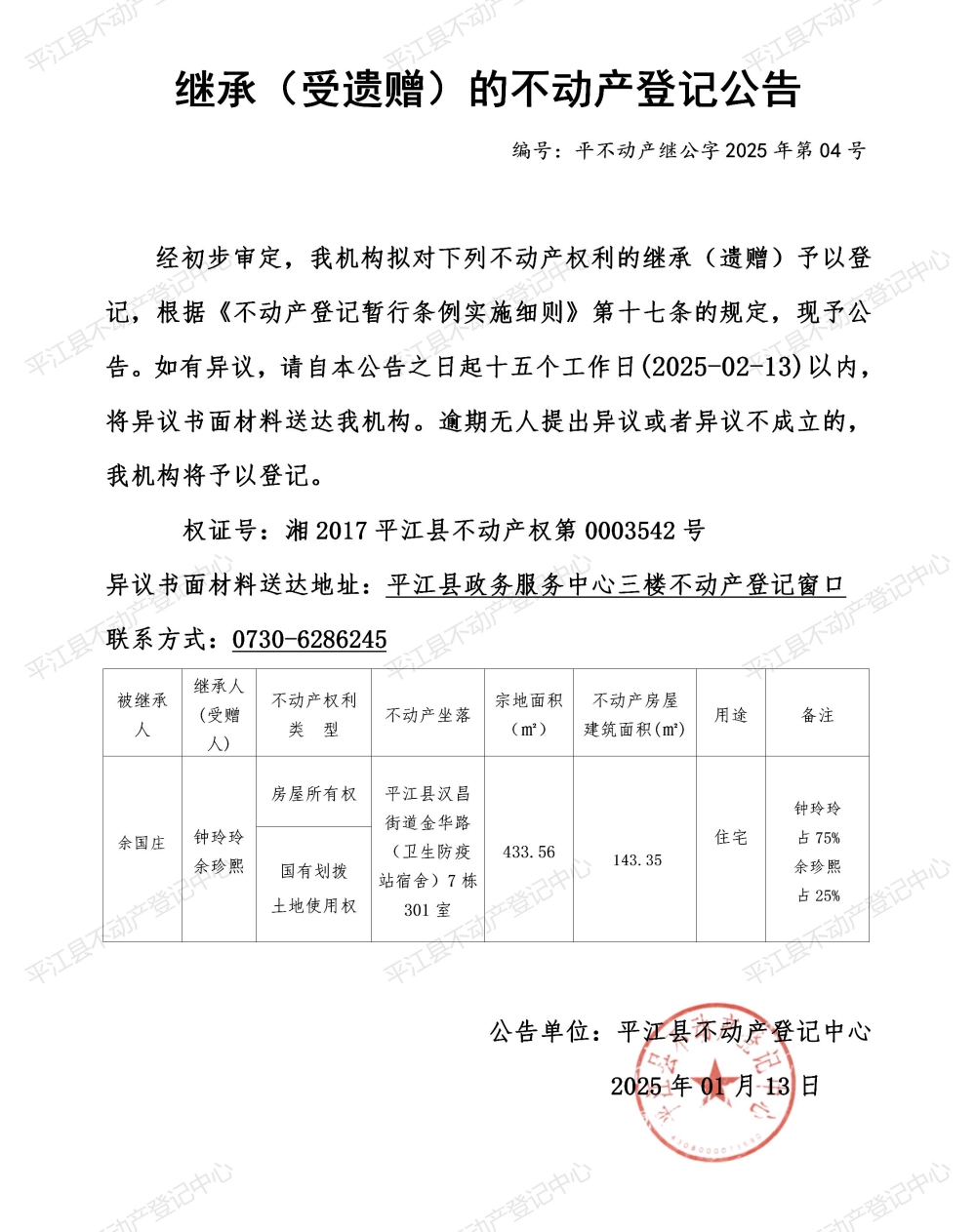 钟玲玲 余珍熙 继承不动产登记公告202504