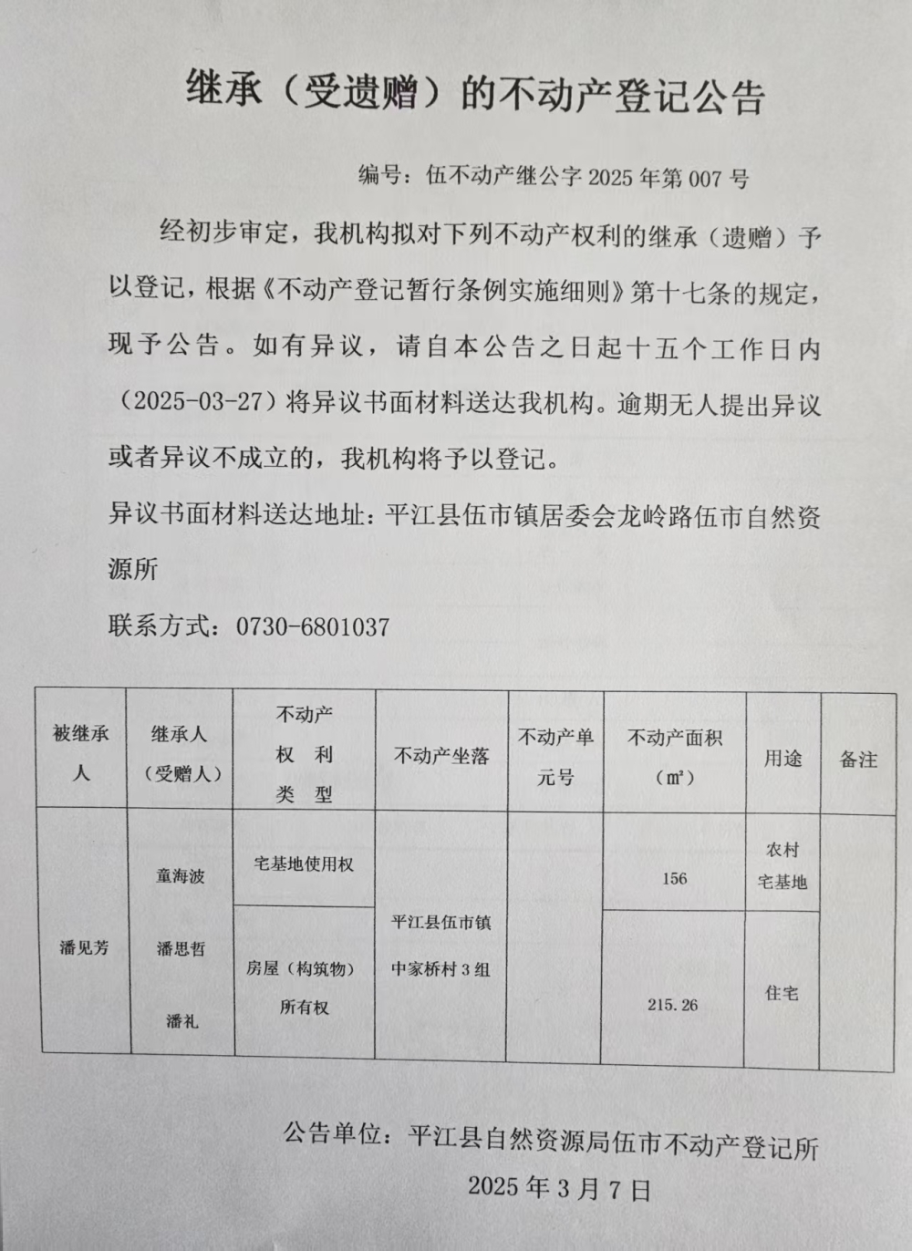 童海波 潘思哲 潘礼 继承(受遗赠)的不动产登记公告