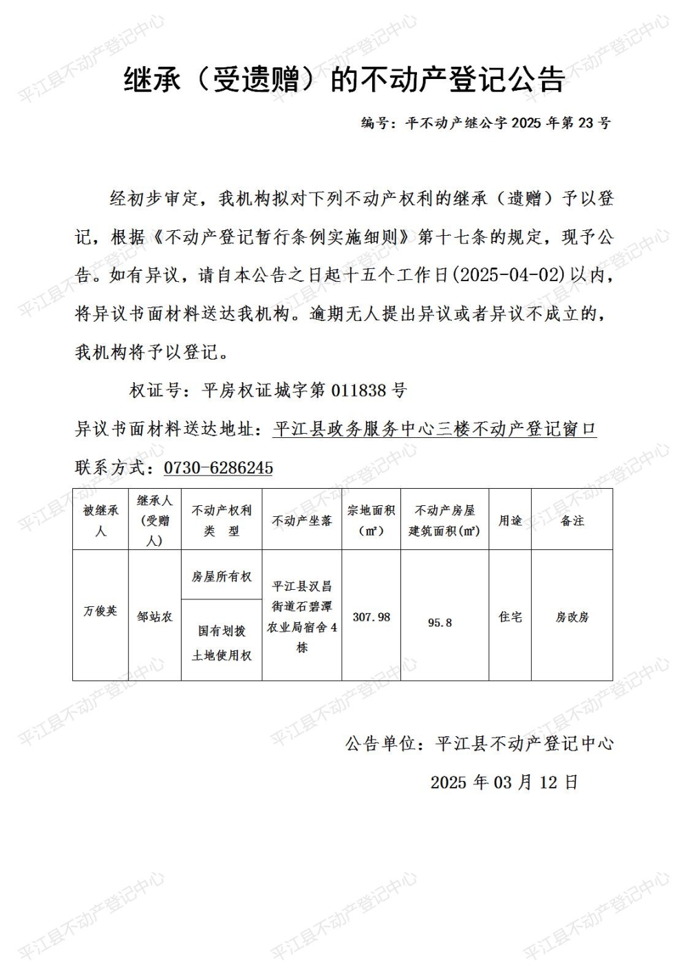 邹站农 继承不动产登记公告202523