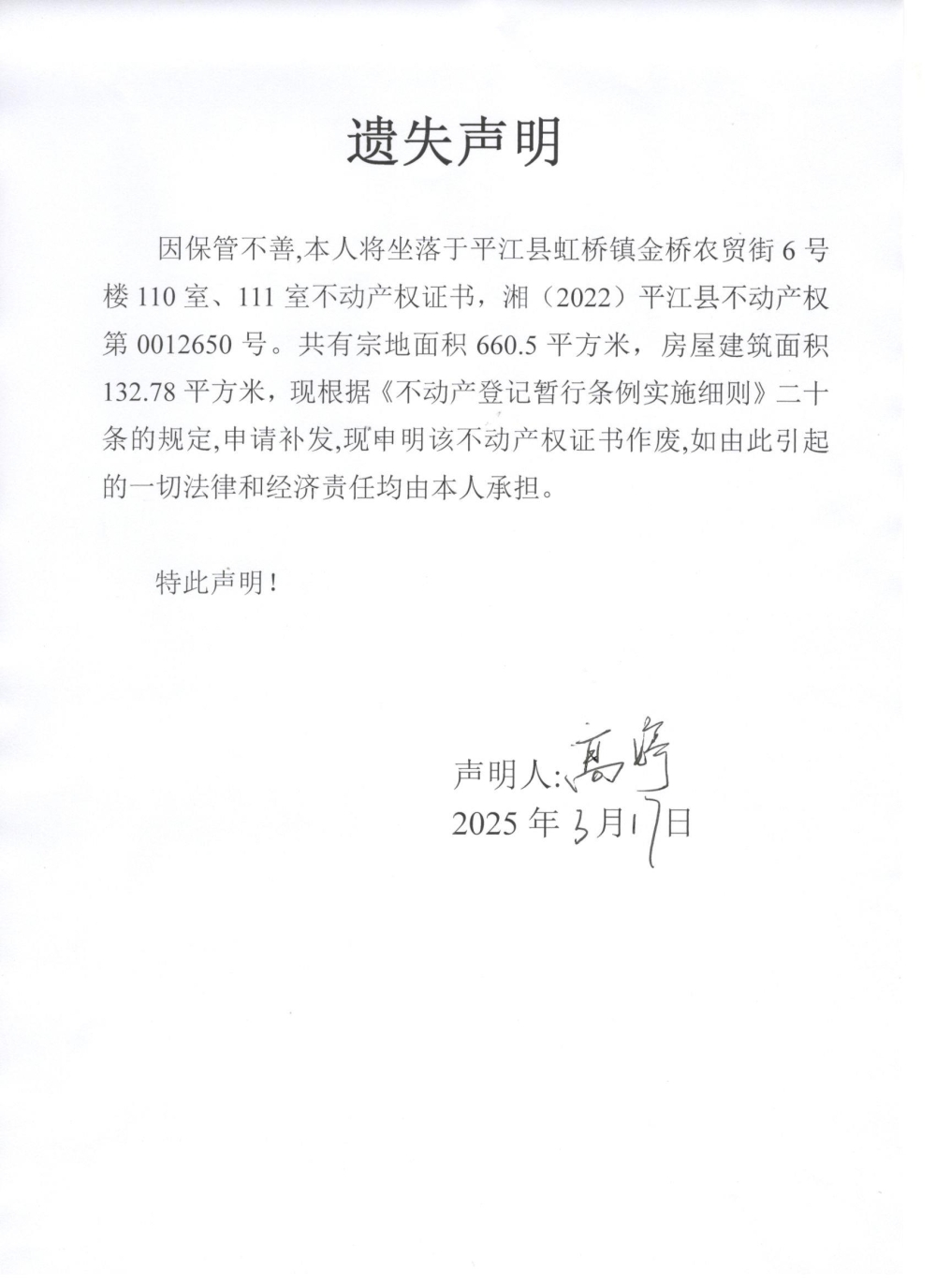 高婷不动产登记证书遗失声明