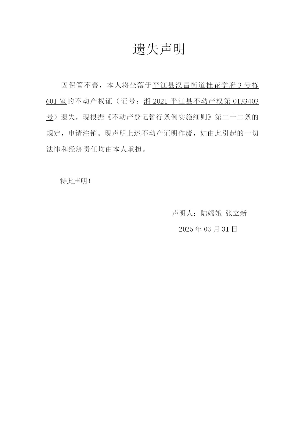 陆嫦娥 张立新 不动产证明遗失声明202522