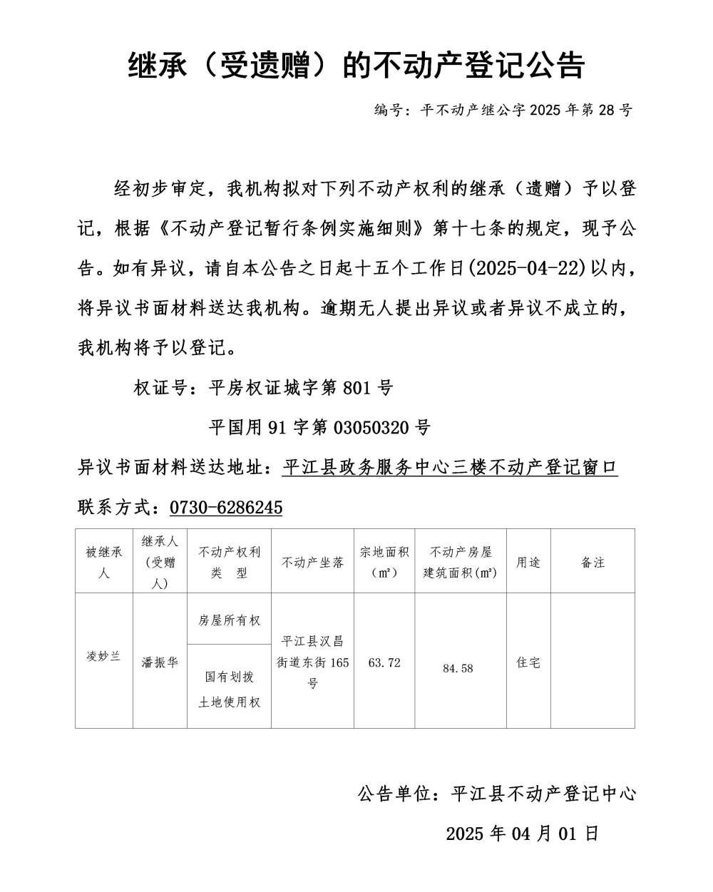 潘振华 继承不动产登记公告202528