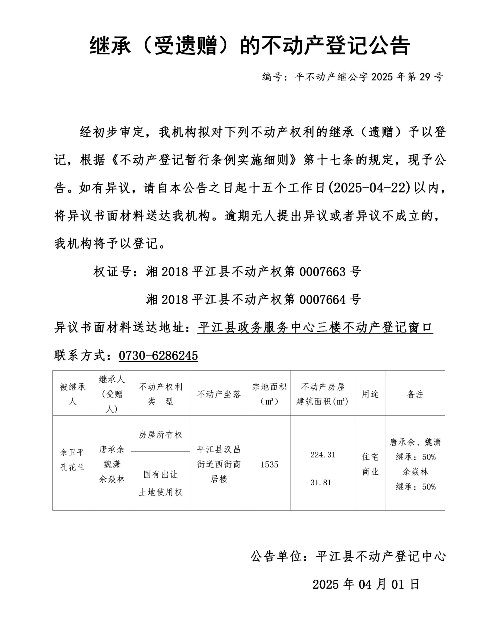 唐承余 魏潇 余焱林 继承不动产登记公告202529