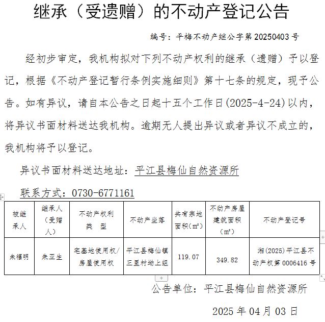 梅仙镇三里村坳上组朱亚生继承朱福明不动产公告