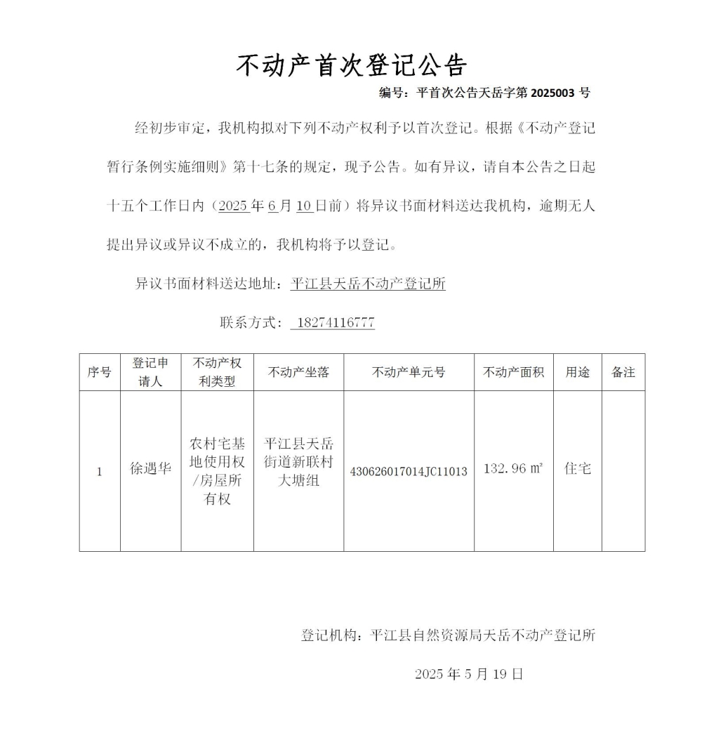 新联村徐遇华不动产首次登记公告