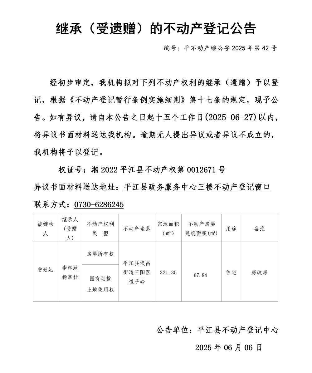 李辉跃 杨掌桂 继承不动产登记公告202543