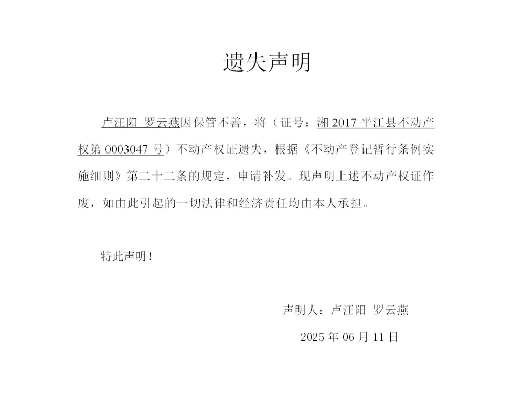 卢汪阳 罗云燕 不动产权证遗失声明202536