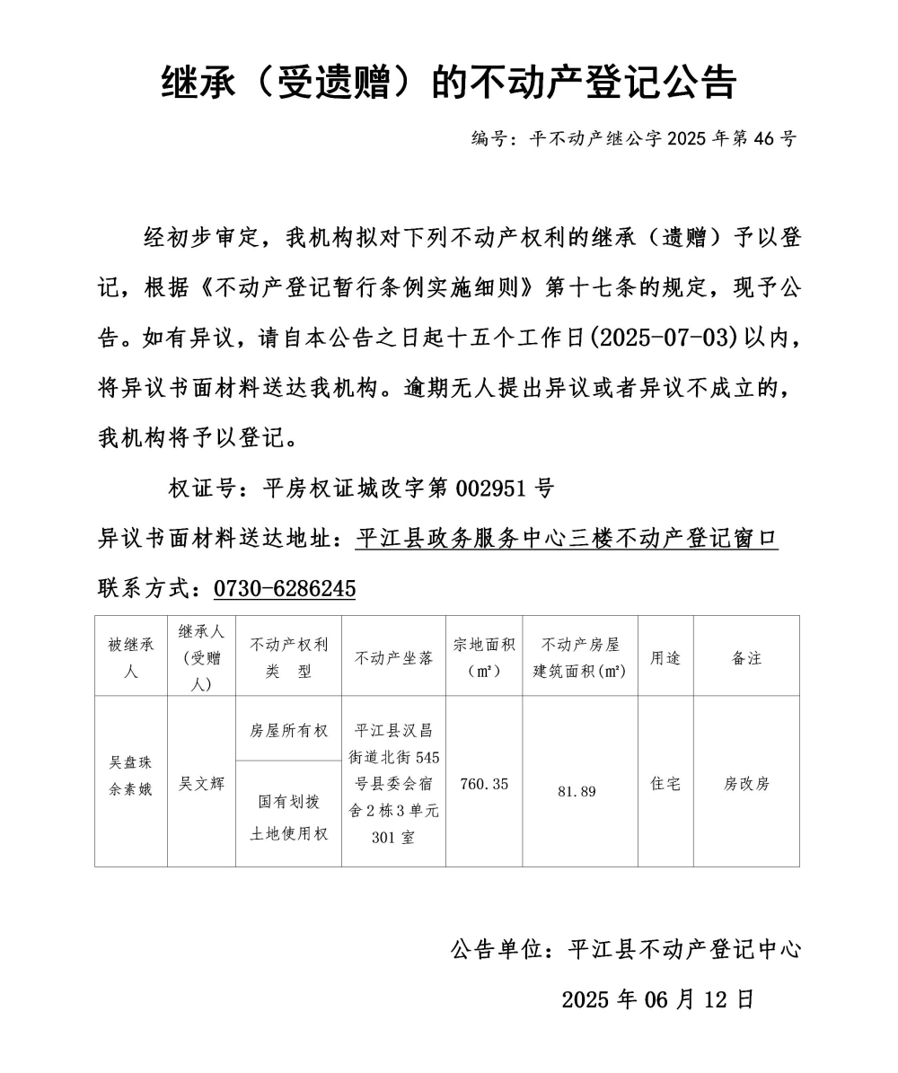 吴文辉 继承不动产登记公告202546