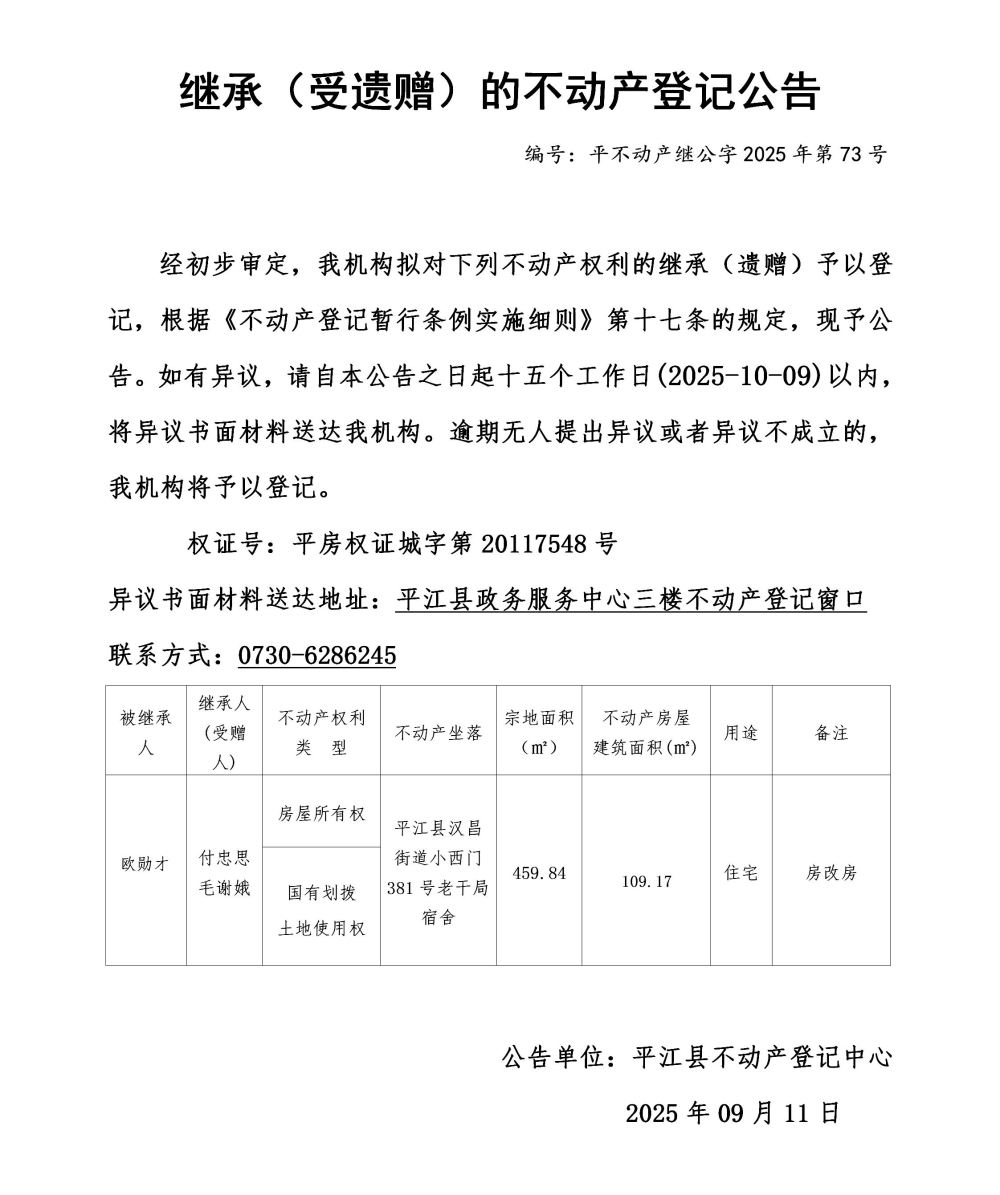 付忠思 毛谢娥 继承不动产登记公告202573
