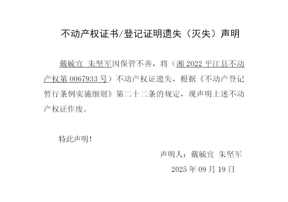 戴毓宜 朱坚军 不动产权证遗失声明202571