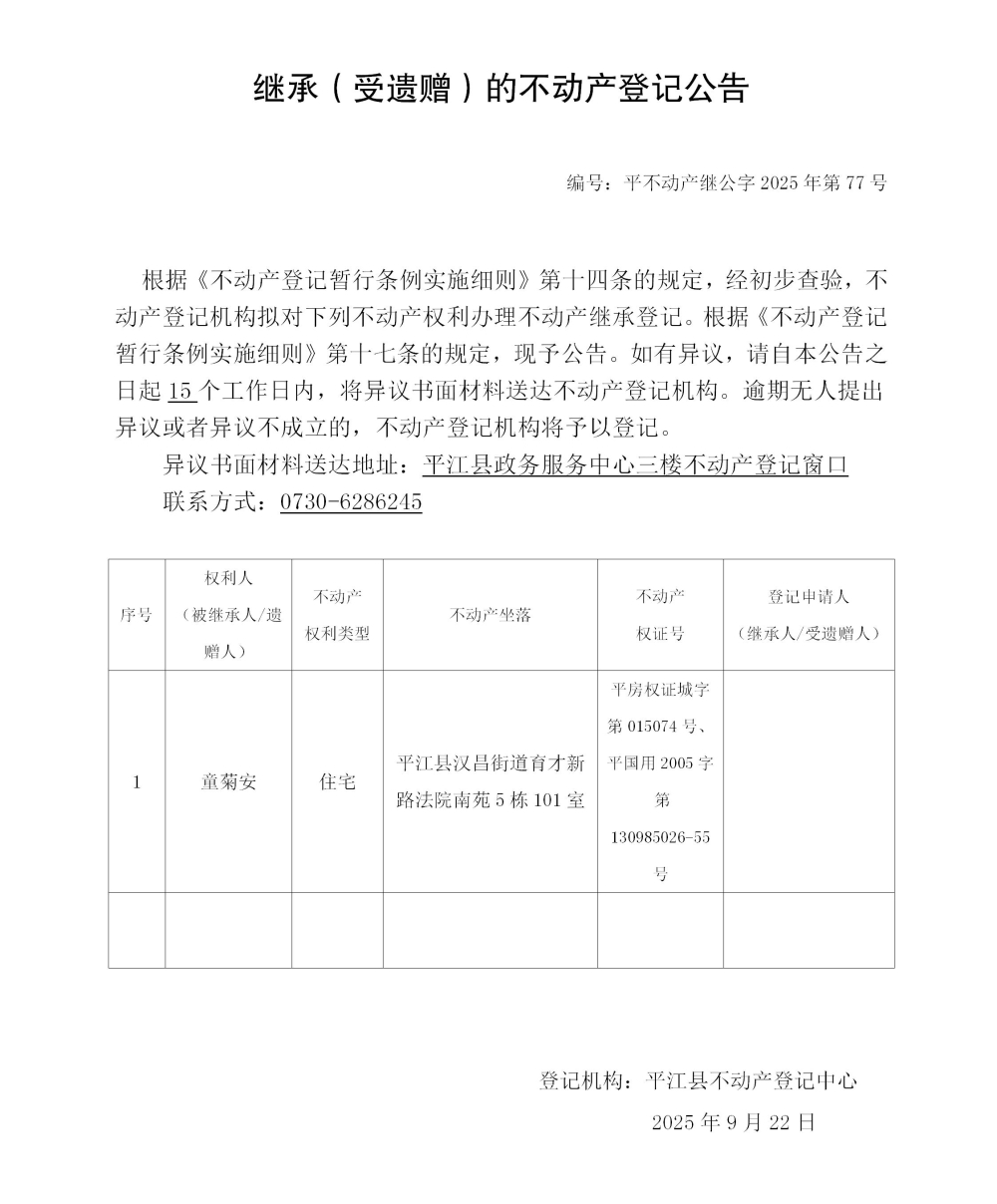 黄燕燕 继承不动产登记公告202577