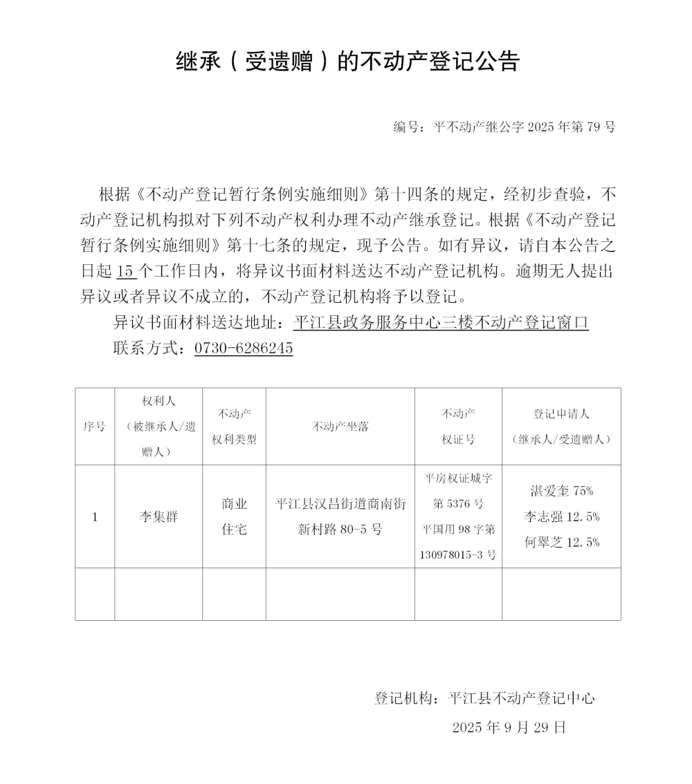 李集群 继承不动产登记公告202579