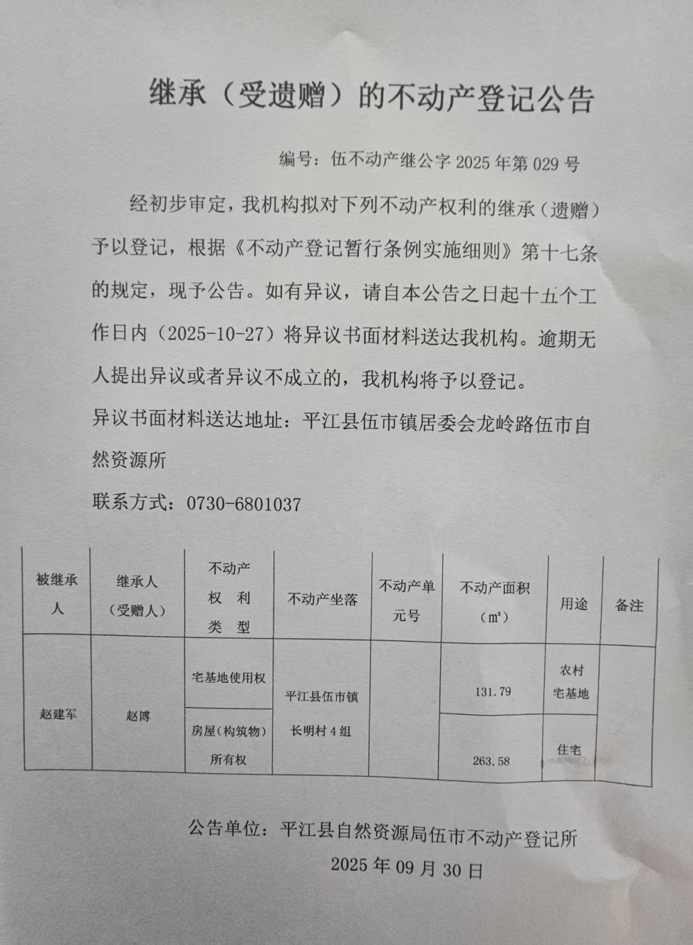 赵博 继承的不动产登记公告
