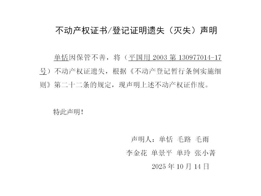 单恬 毛路 毛雨 李金花 单景平 单玲 张小菁不动产权证遗失声明202576