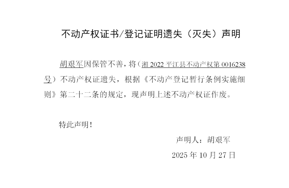 胡艰军 不动产权证遗失声明202579