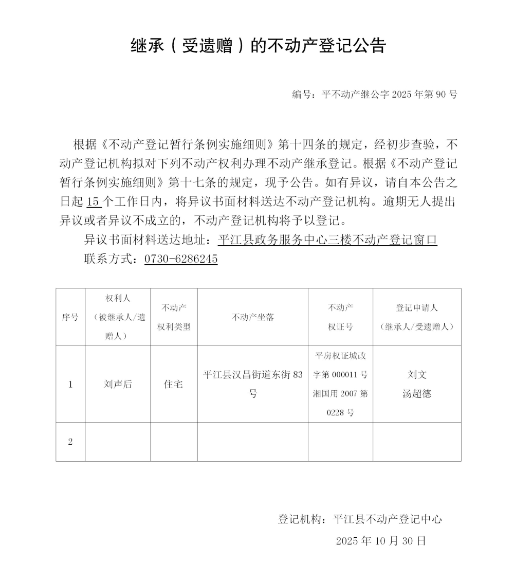 刘文 汤超德 继承不动产登记公告202590