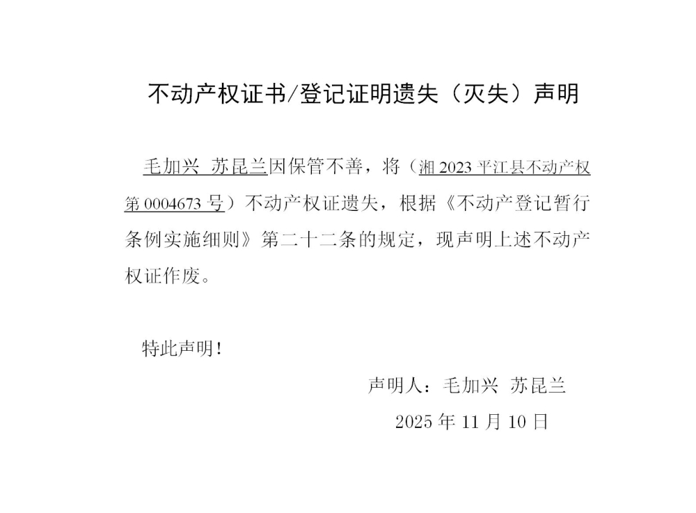 毛加兴 苏昆兰 不动产权证遗失声明202584