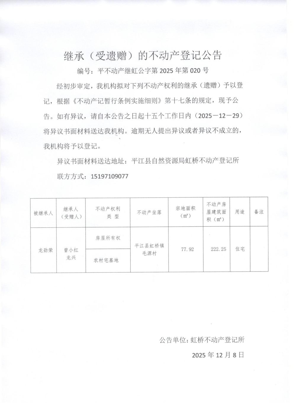虹桥镇曾小红 龙兴不动产受继承首次登记公告
