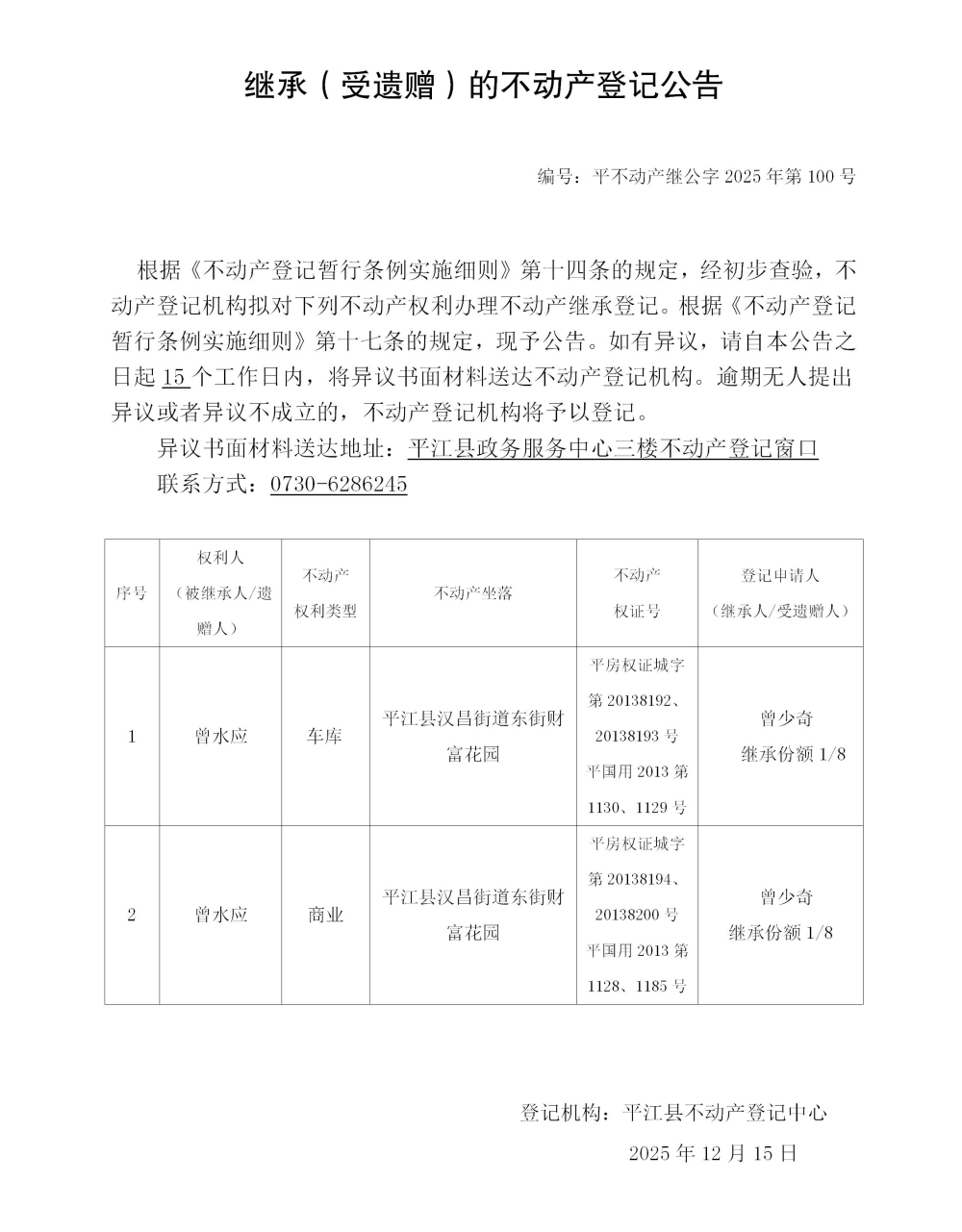 曾少奇 继承不动产登记公告2025101