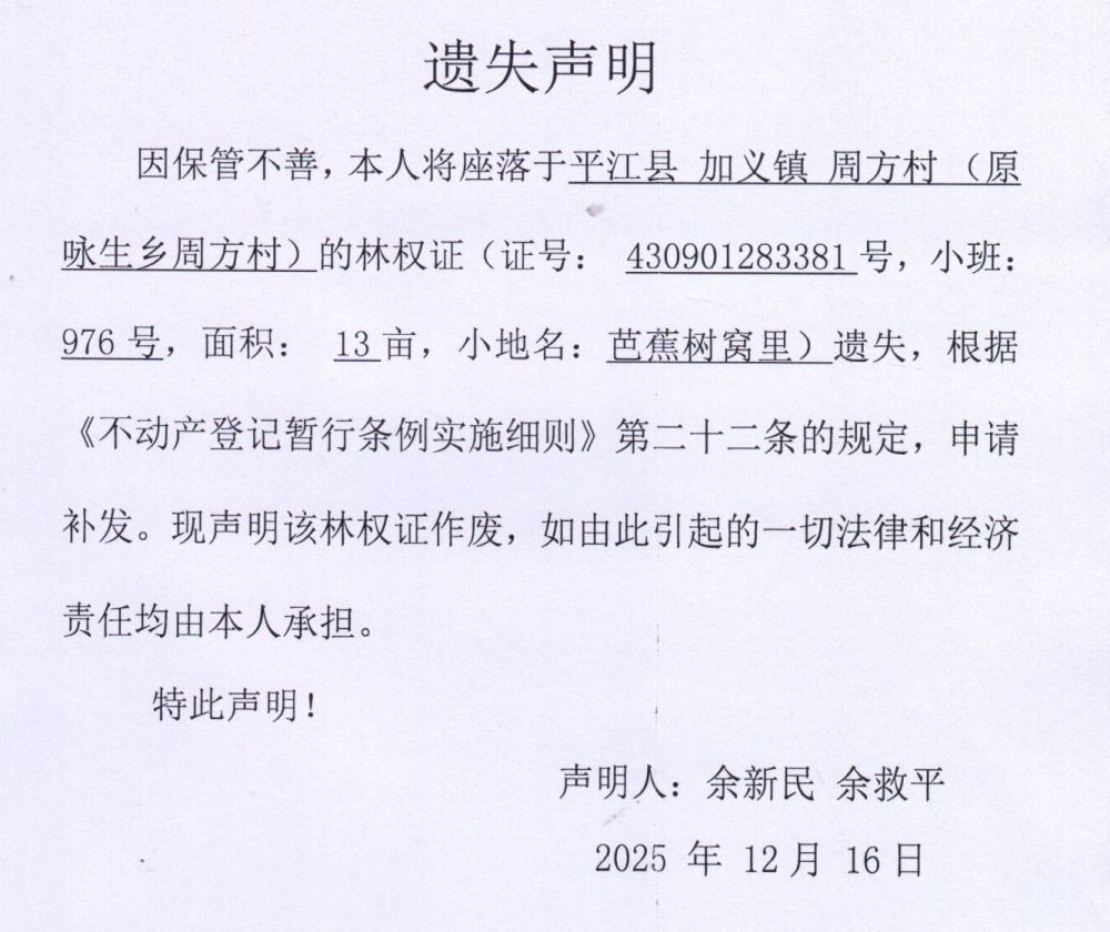 余新民、余救平林权证遗失声明