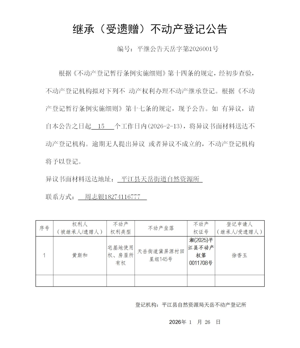 徐香玉 继承(受遗赠)不动产登记公告