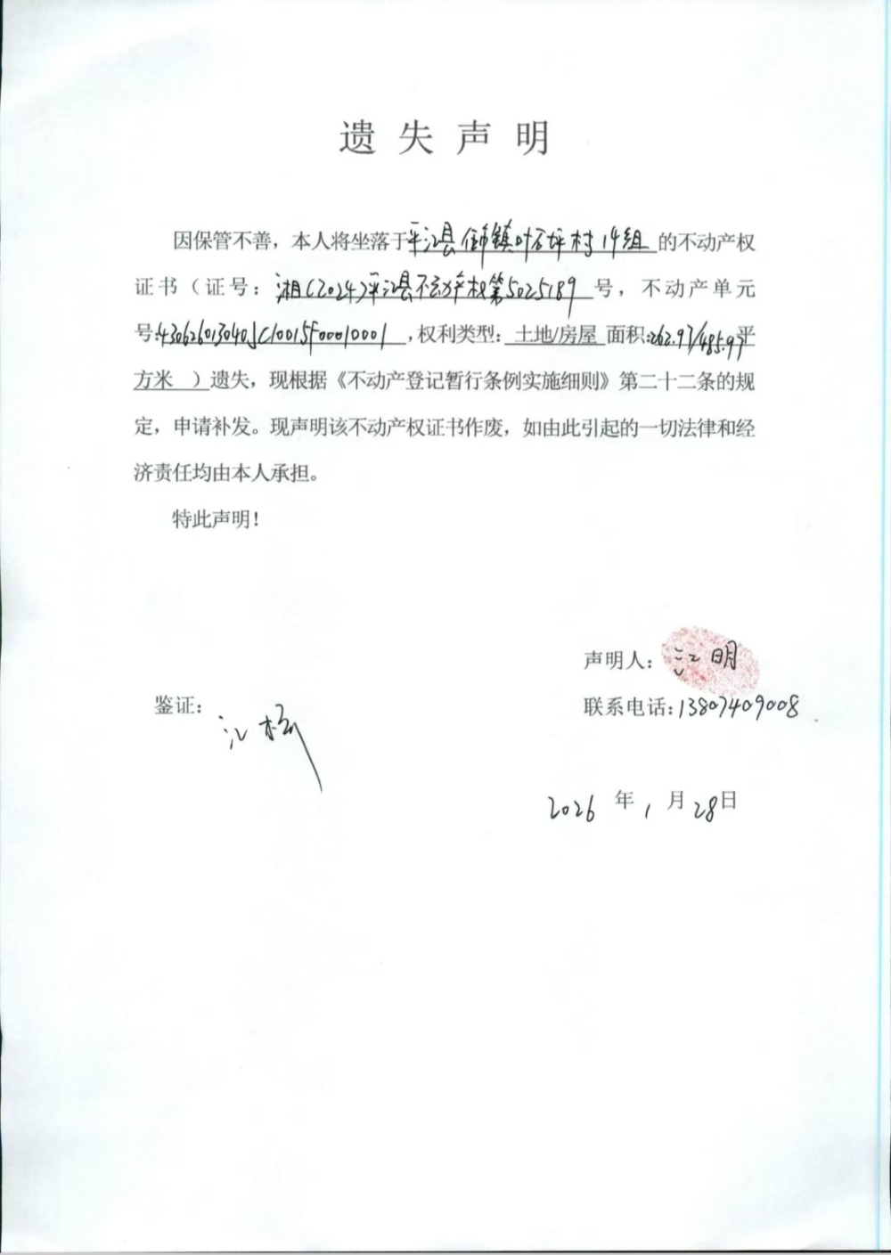 江明 不动产权证遗失声明