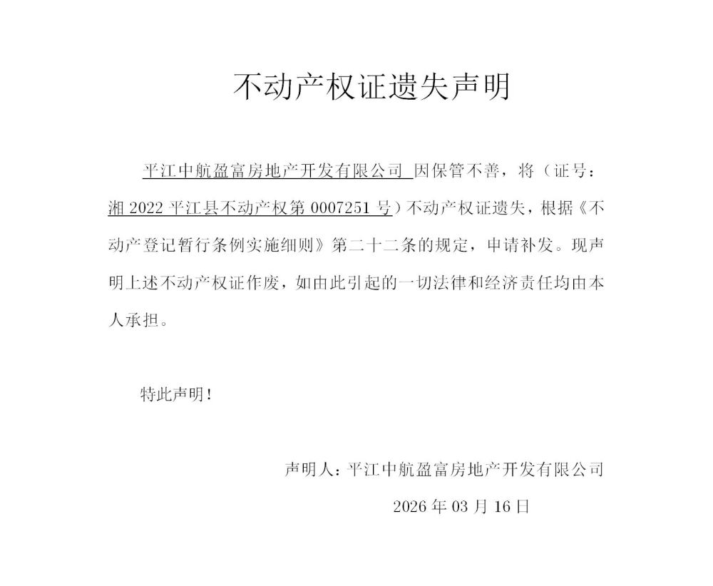 平江中航盈富房地产开发有限公司 不动产权证遗失声明202614