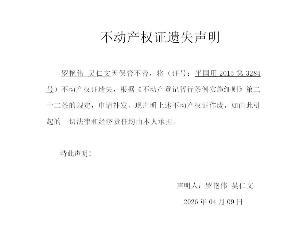 罗艳伟 吴仁文 不动产权证遗失声明202622