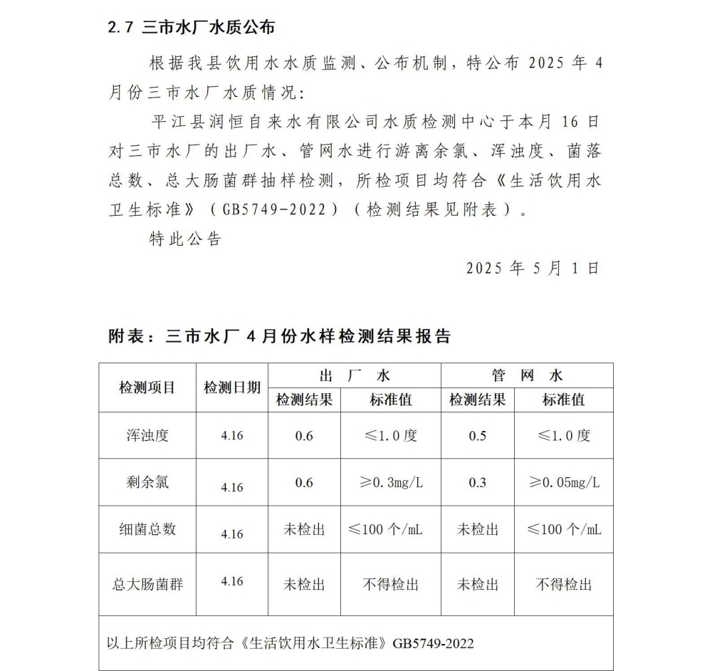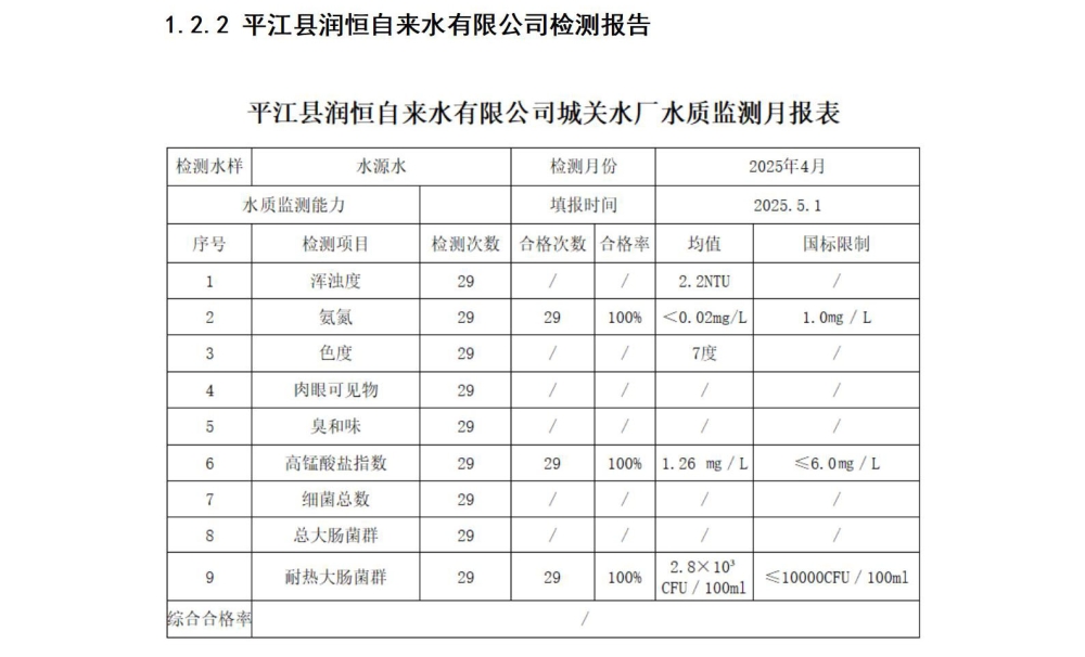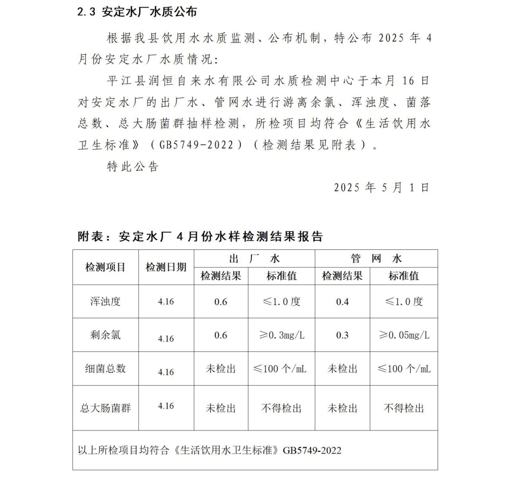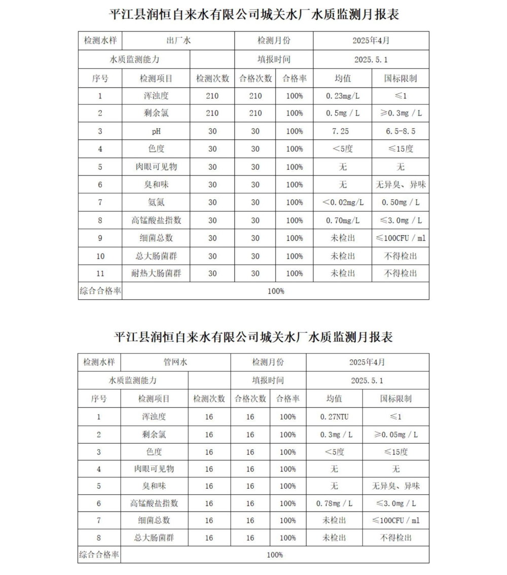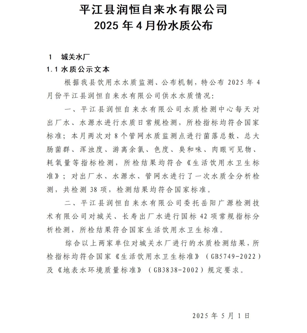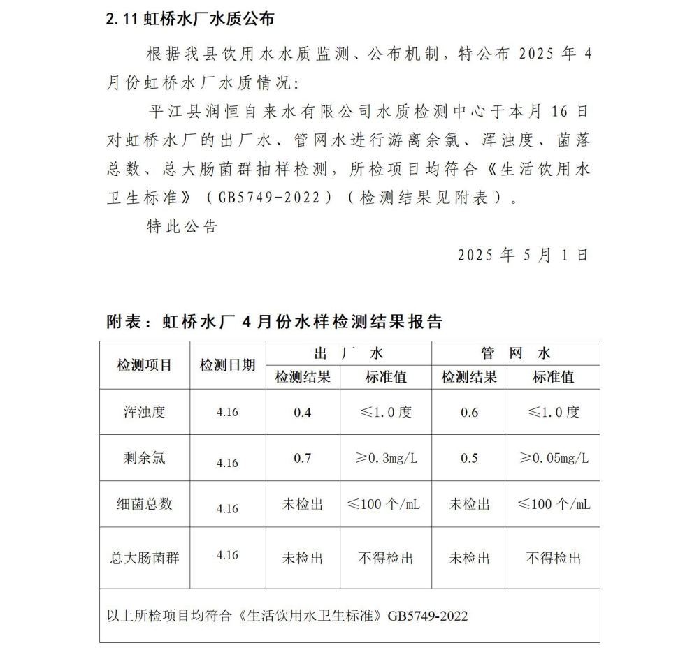 平江县润恒自来水有限公司2025年4月份水质公示