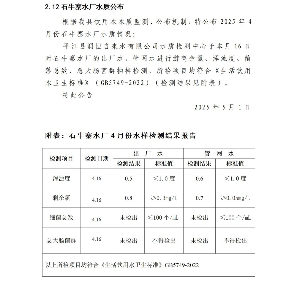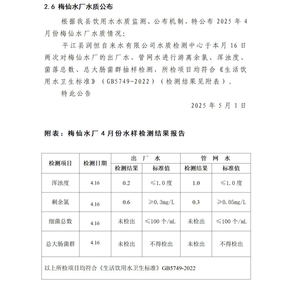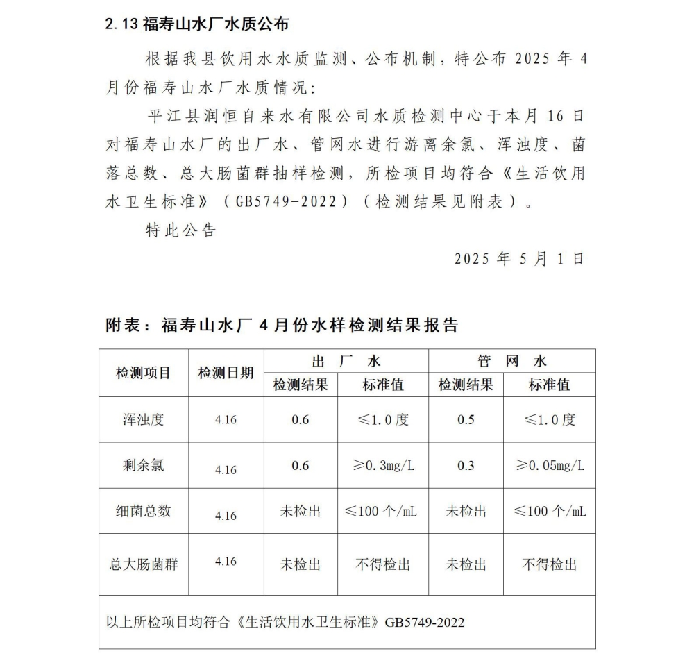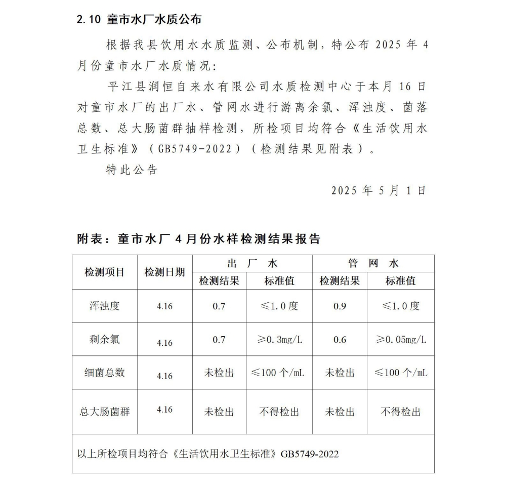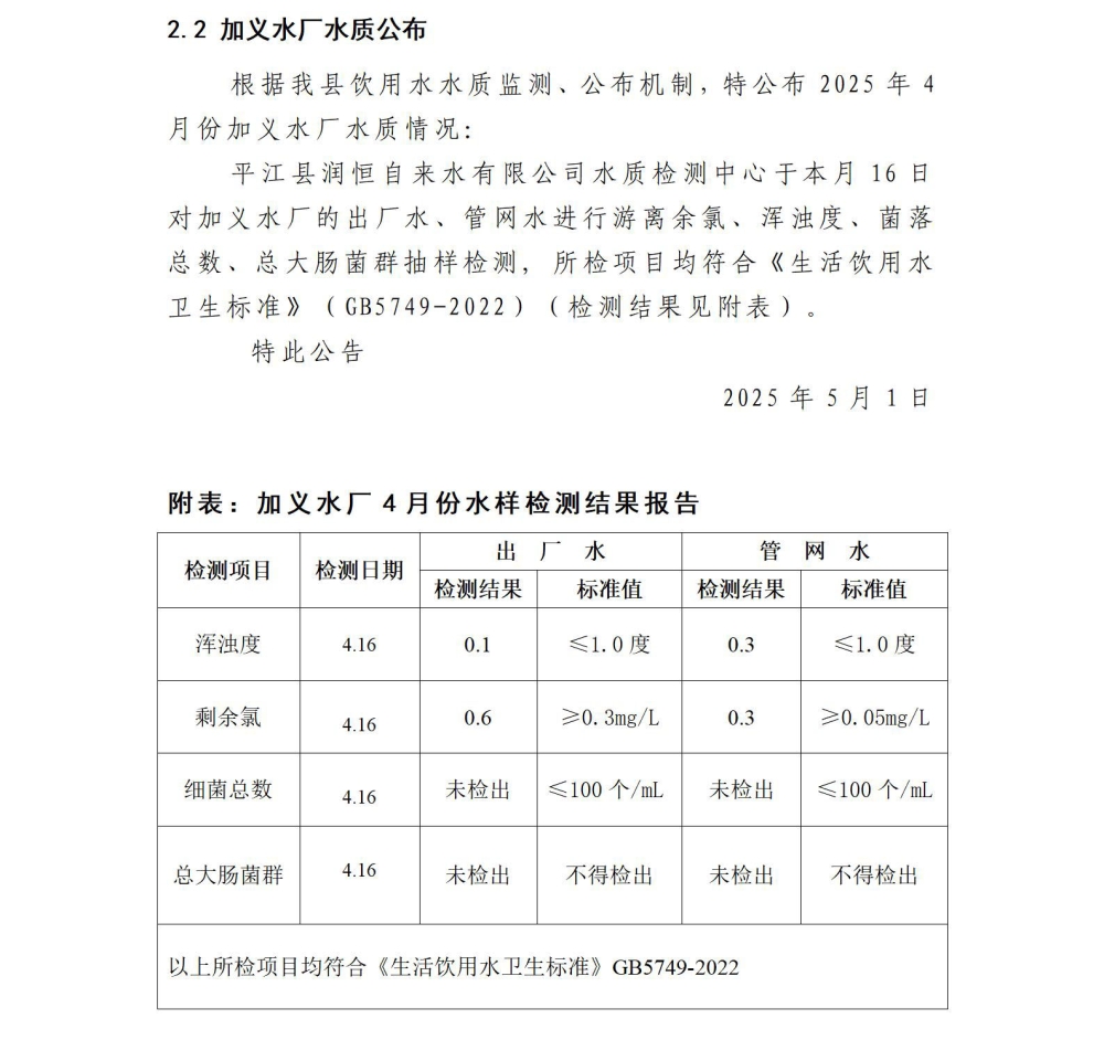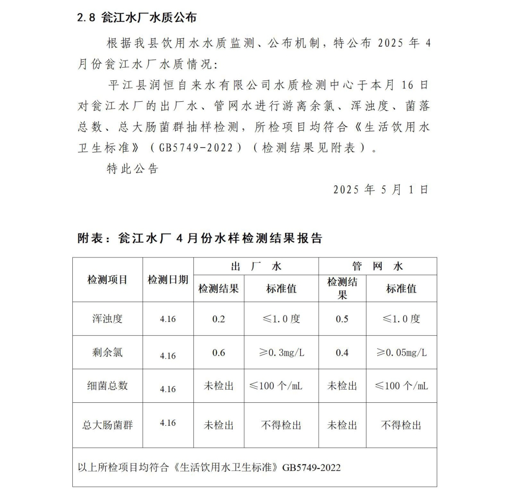平江县润恒自来水有限公司2025年4月份水质公示