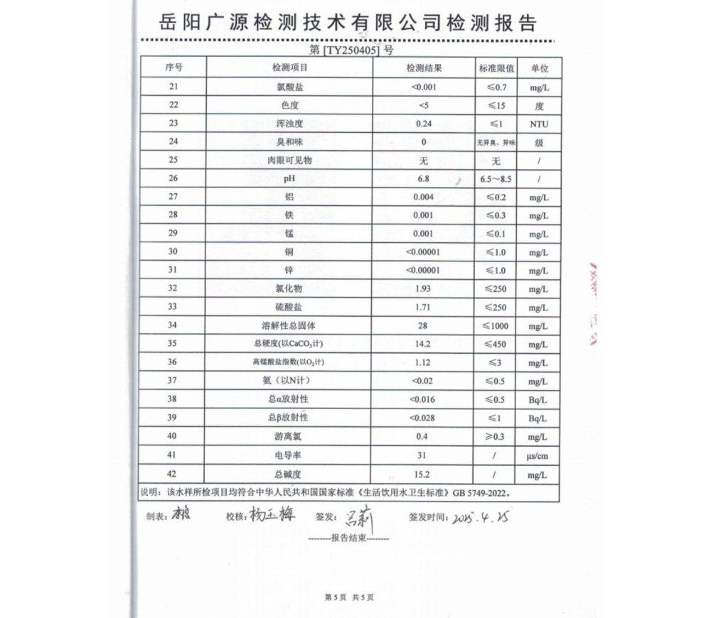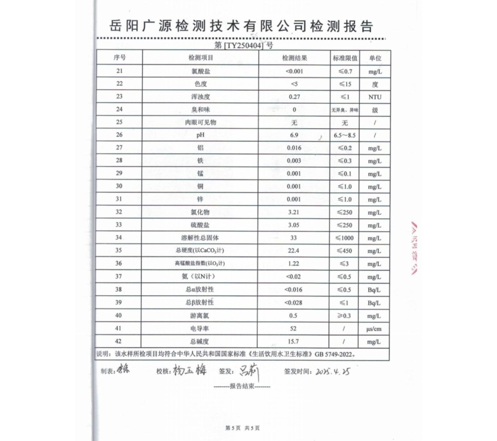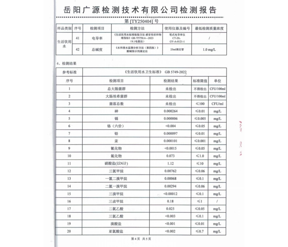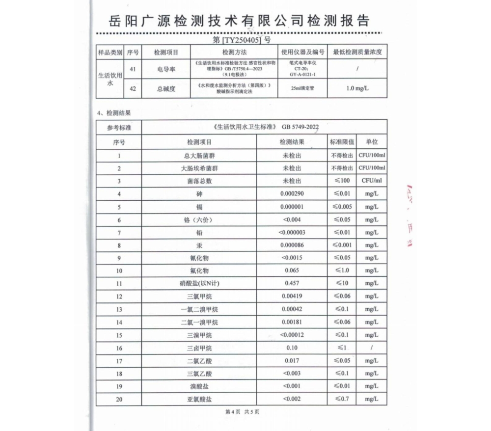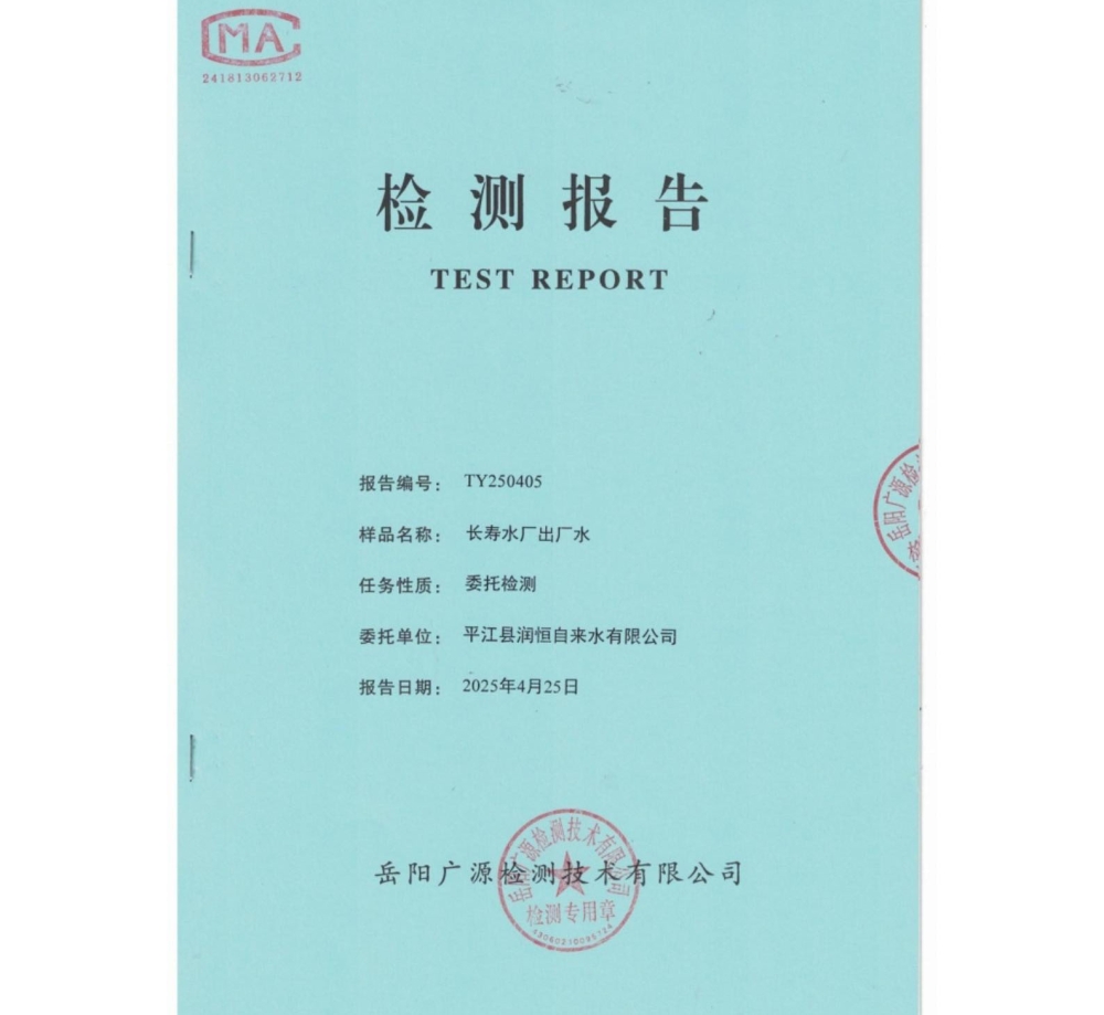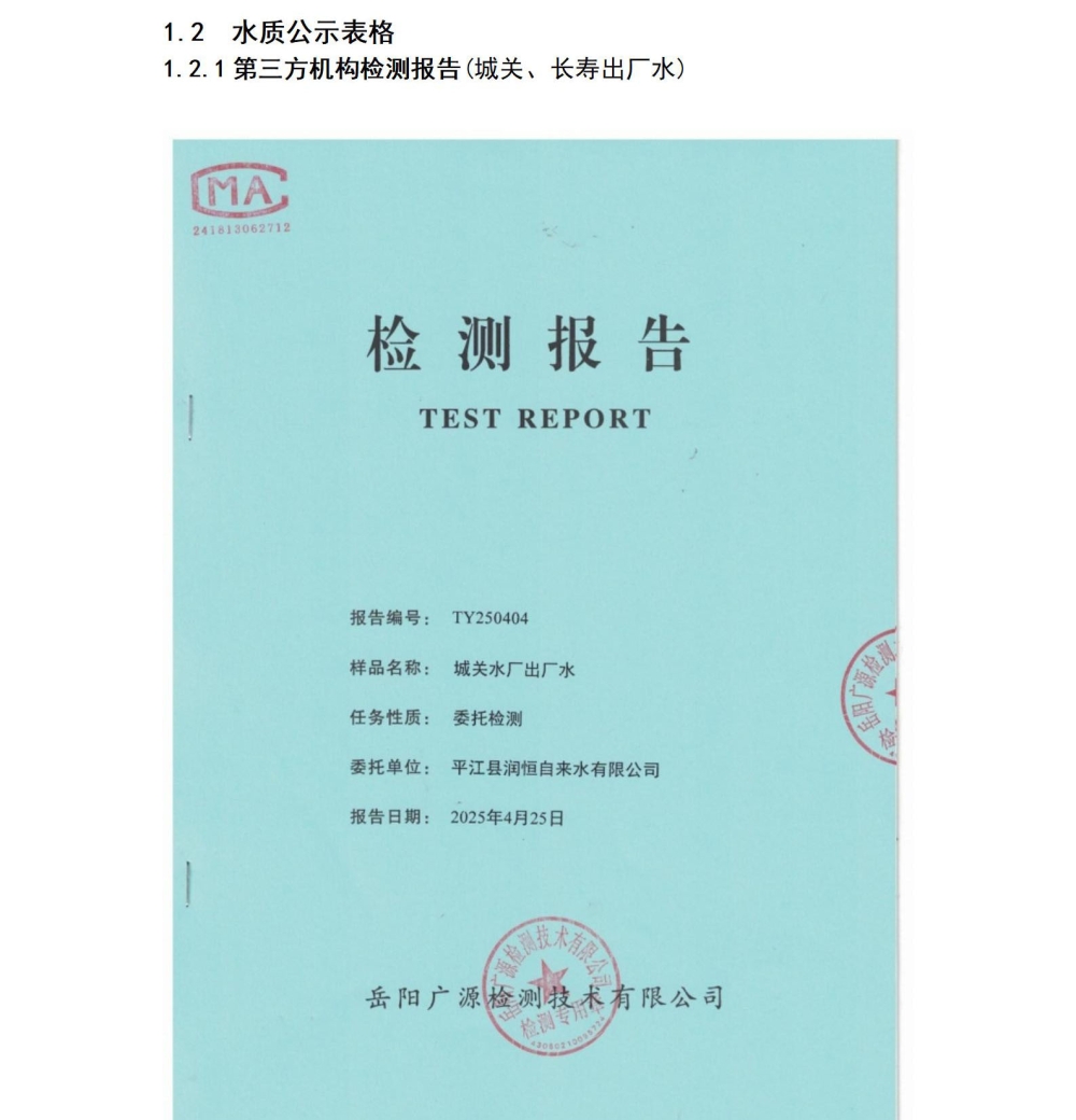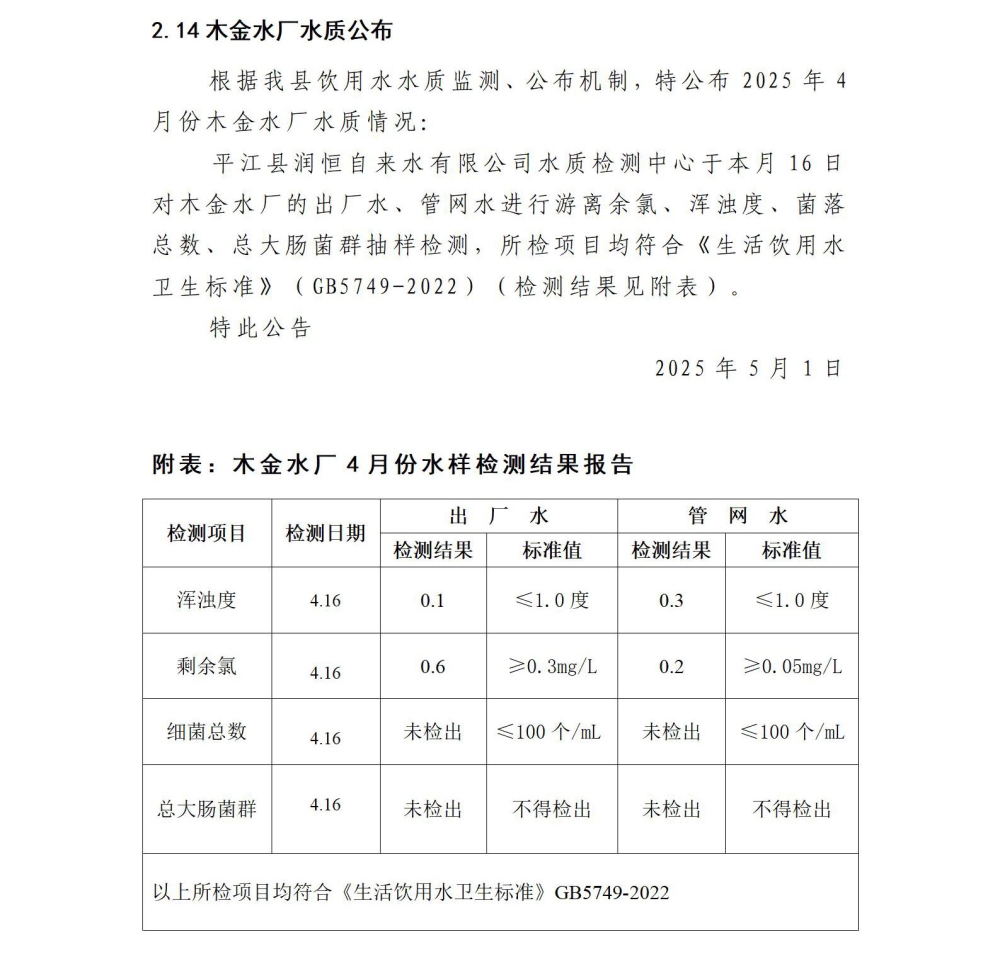 平江县润恒自来水有限公司2025年4月份水质公示