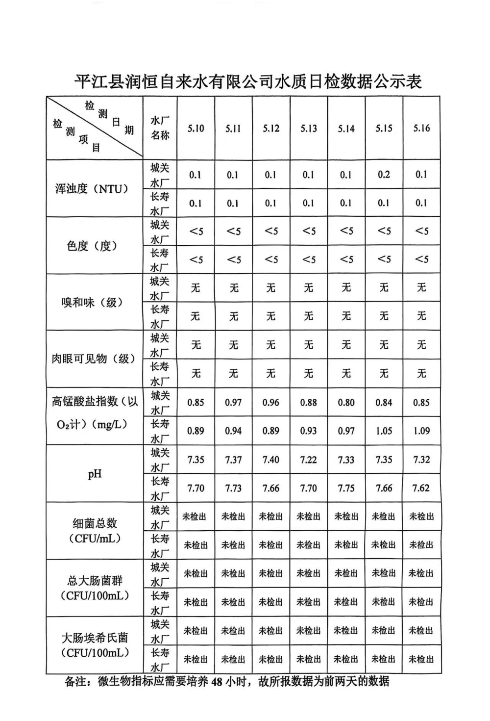 平江县润恒自来水有限公司水质日检数据公示表5.16
