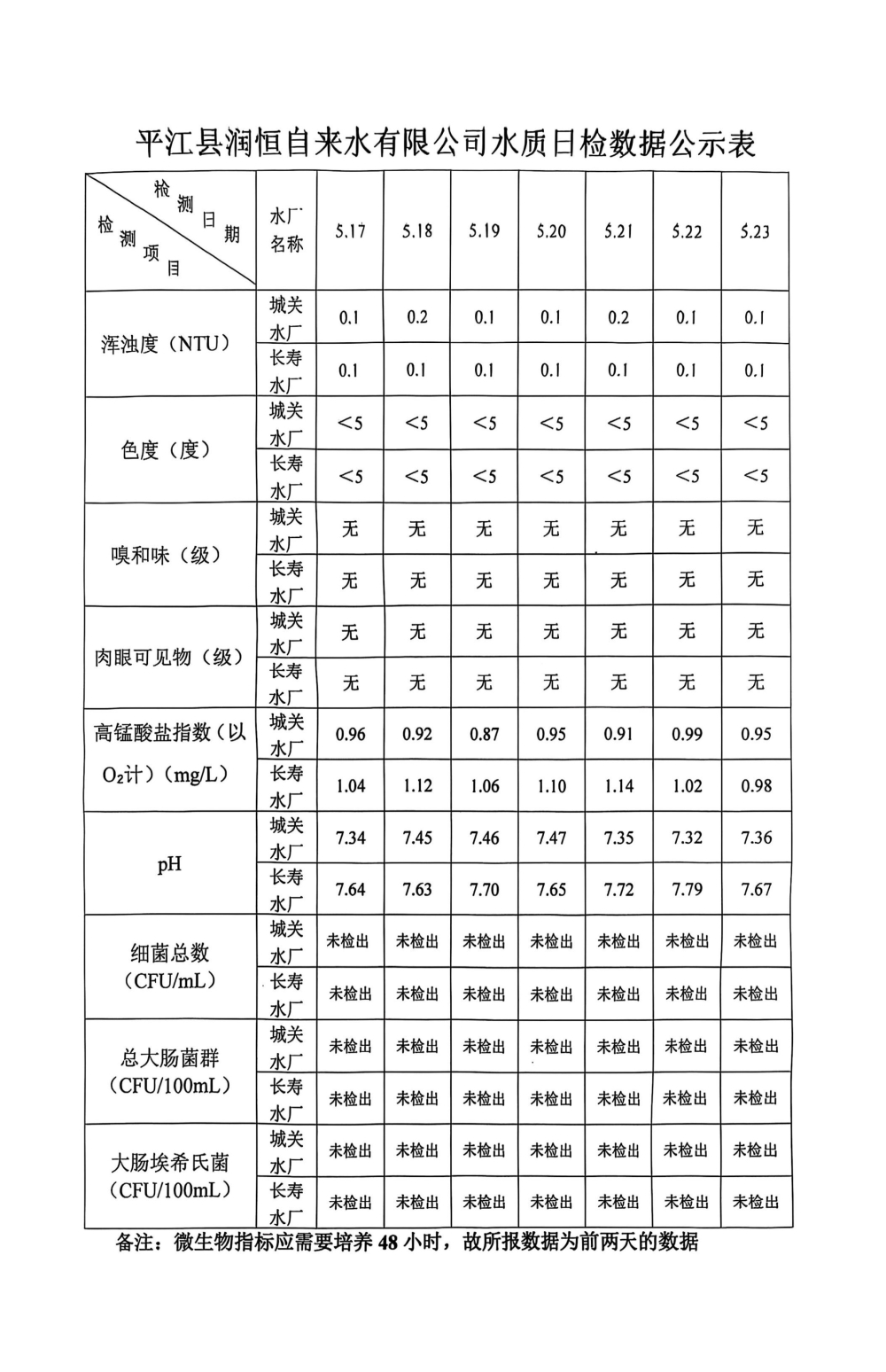 平江县润恒自来水有限公司水质日检数据公示表5.23