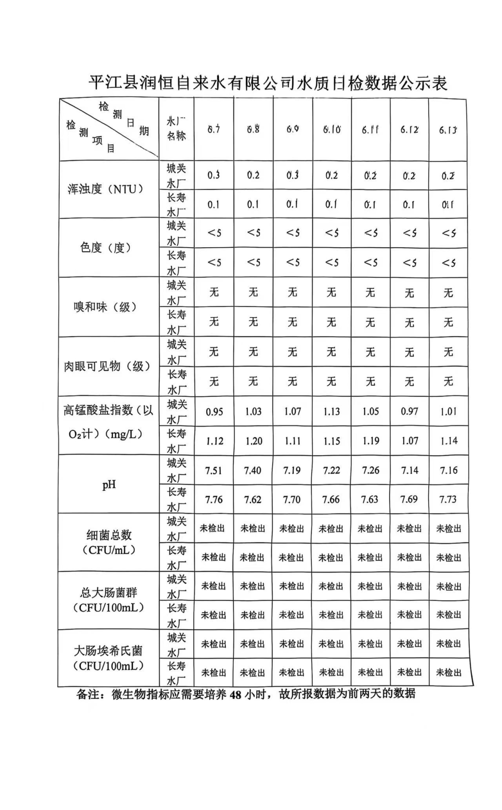 平江县润恒自来水有限公司水质日检数据公示表6.13