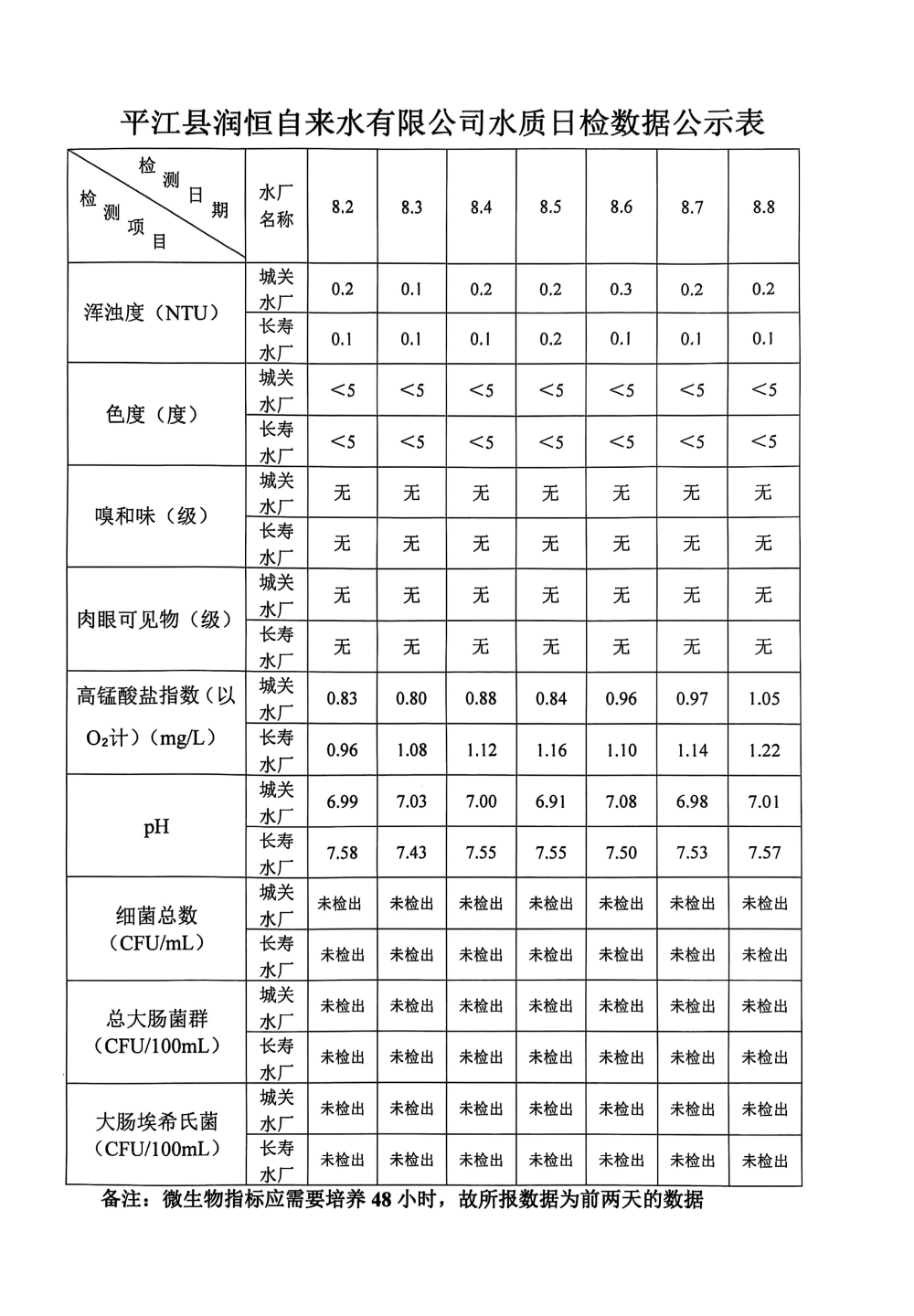 平江县润恒自来水有限公司水质日检数据公示表8.8