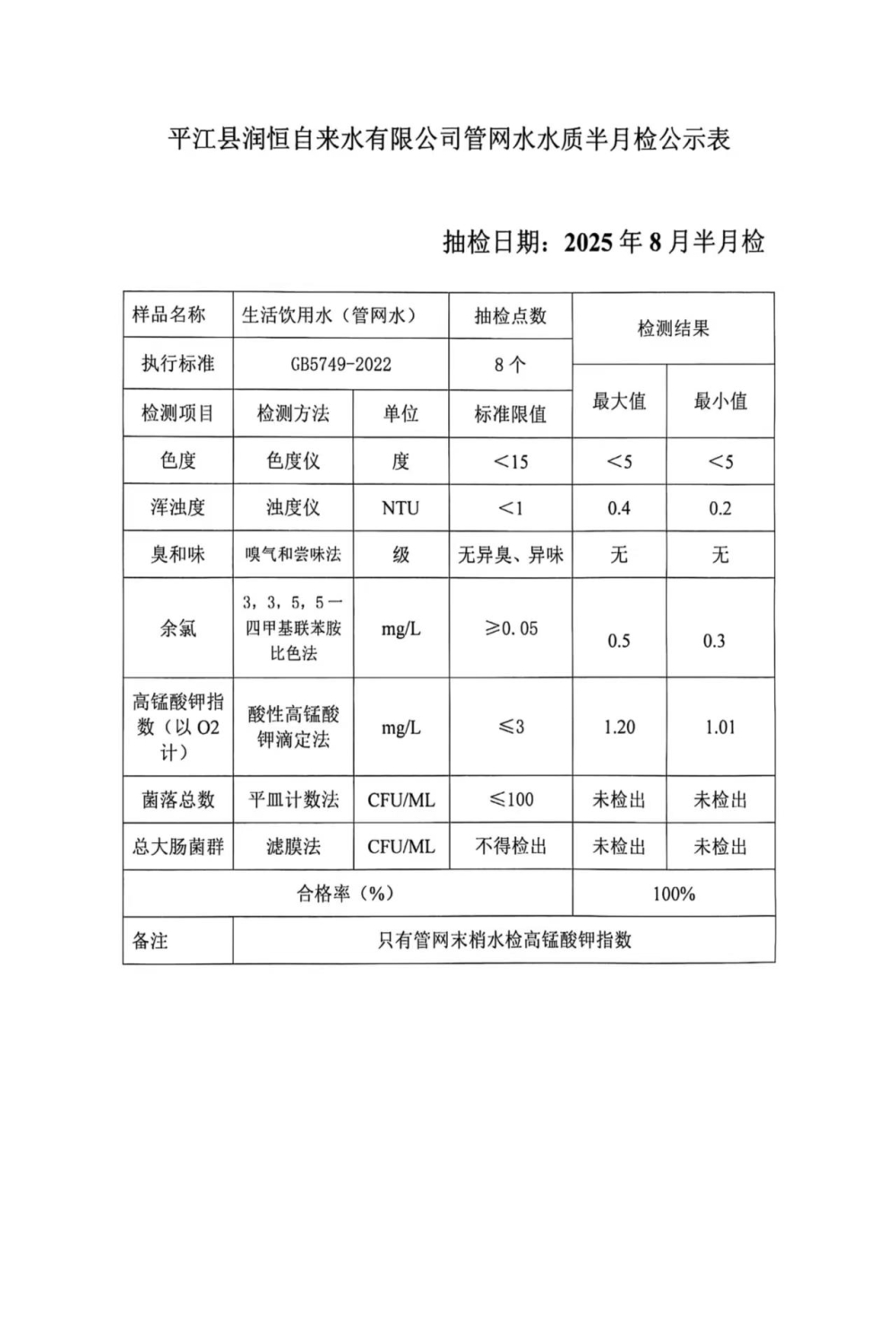 平江县润恒自来水有限公司管网水水质半月检公示表8.29