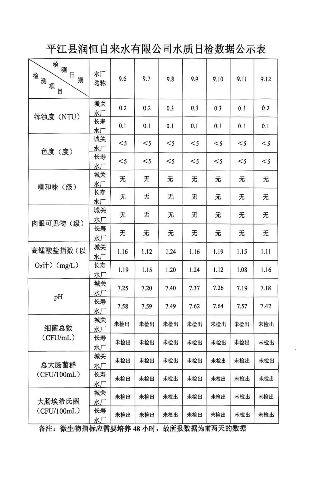 平江县润恒自来水有限公司水质日检数据公示表9.12