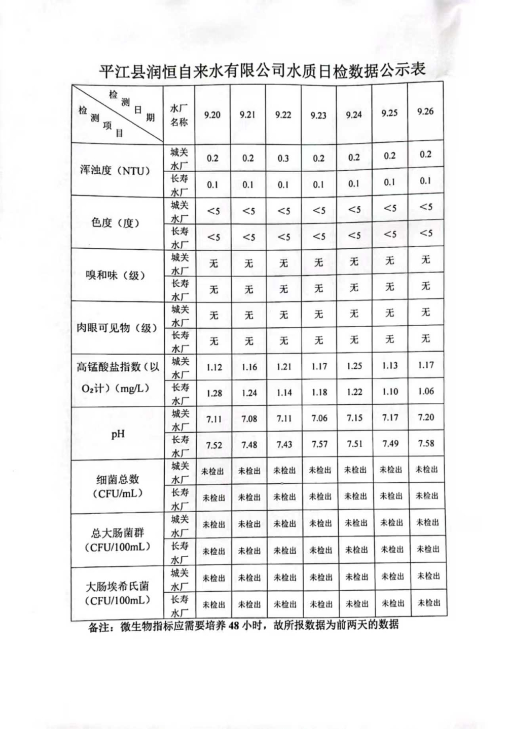 平江县润恒自来水有限公司水质日检数据公示表9.26