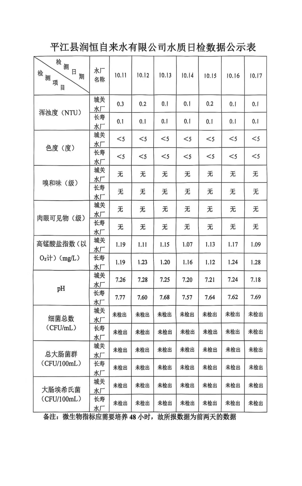 平江县润恒自来水有限公司水质日检数据公示表10.17
