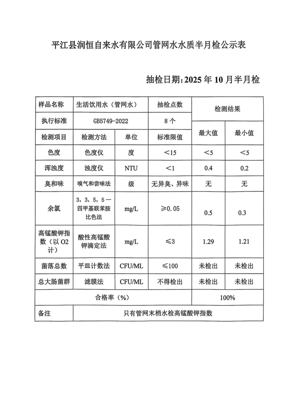 平江县润恒自来水有限公司管网水水质半月检公示表10.17