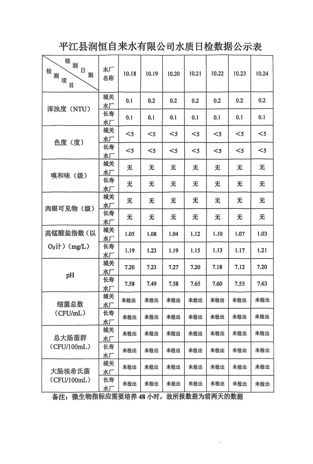平江县润恒自来水有限公司水质日检数据公示表10.24