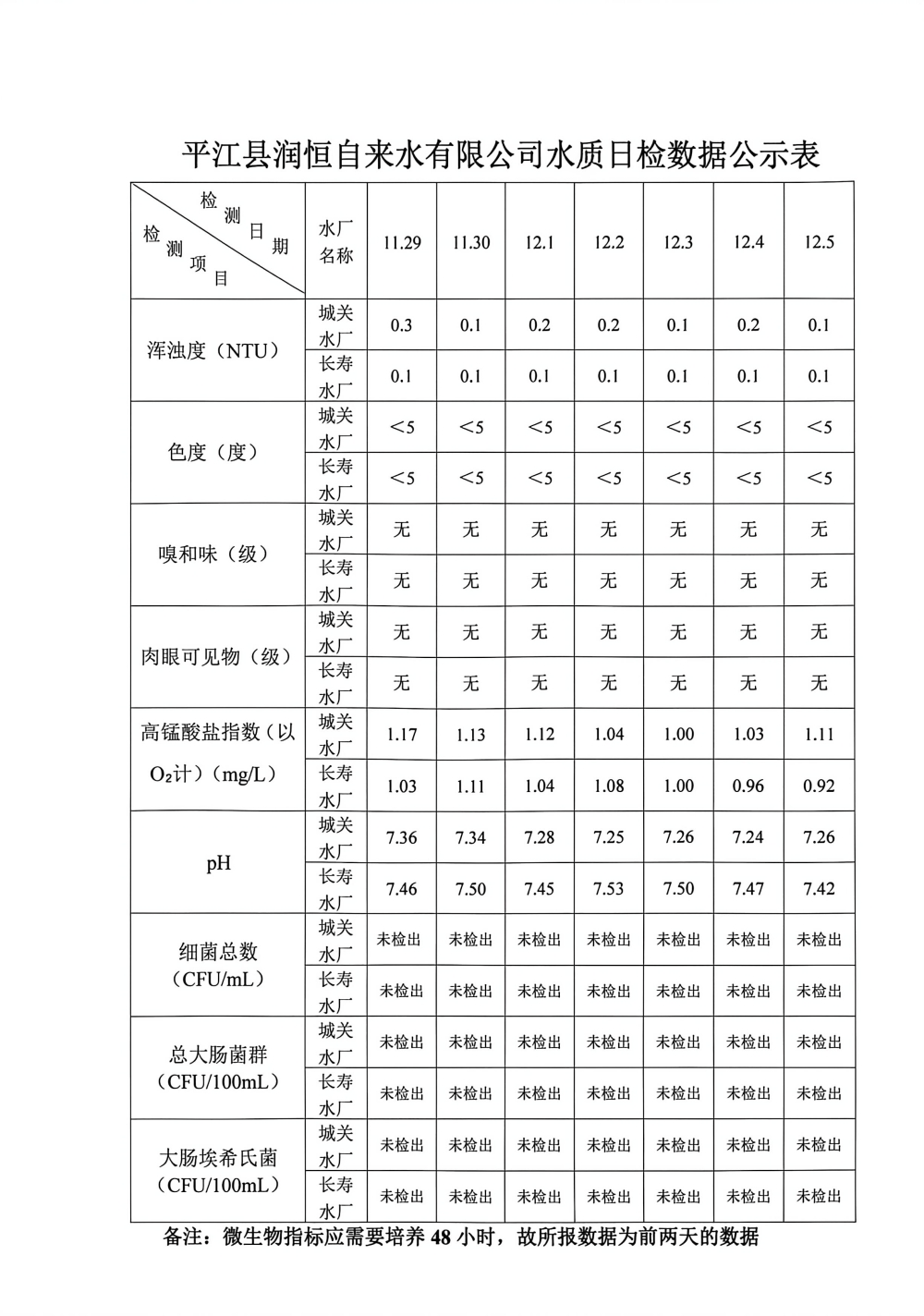 平江县润恒自来水有限公司水质日检数据公示表12.5