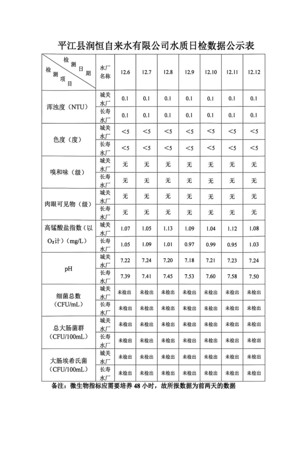 平江县润恒自来水有限公司水质日检数据公示表12.12