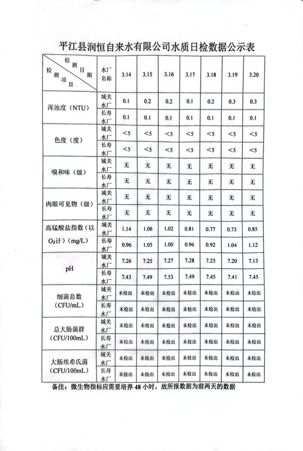 平江县润恒自来水有限公司水质日检数据公示表3.20