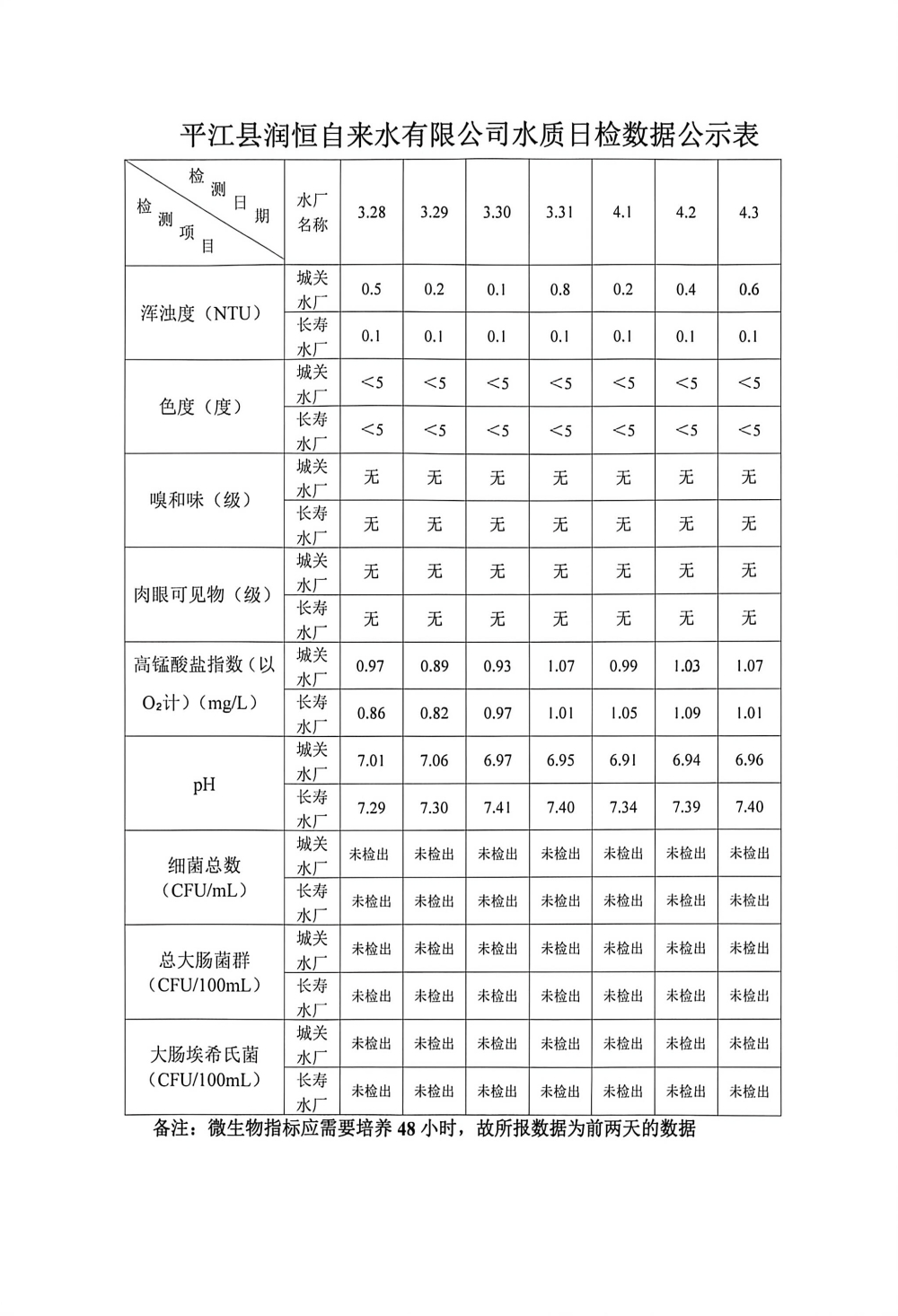 平江县润恒自来水有限公司水质日检数据公示表4.3