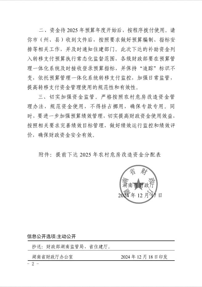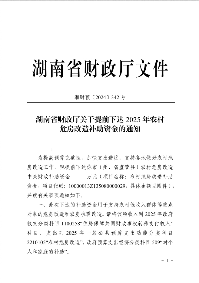 湖南省财政厅关于提前下达2025年农村危房改造补助资金的通知(湘财预[2024]342号)